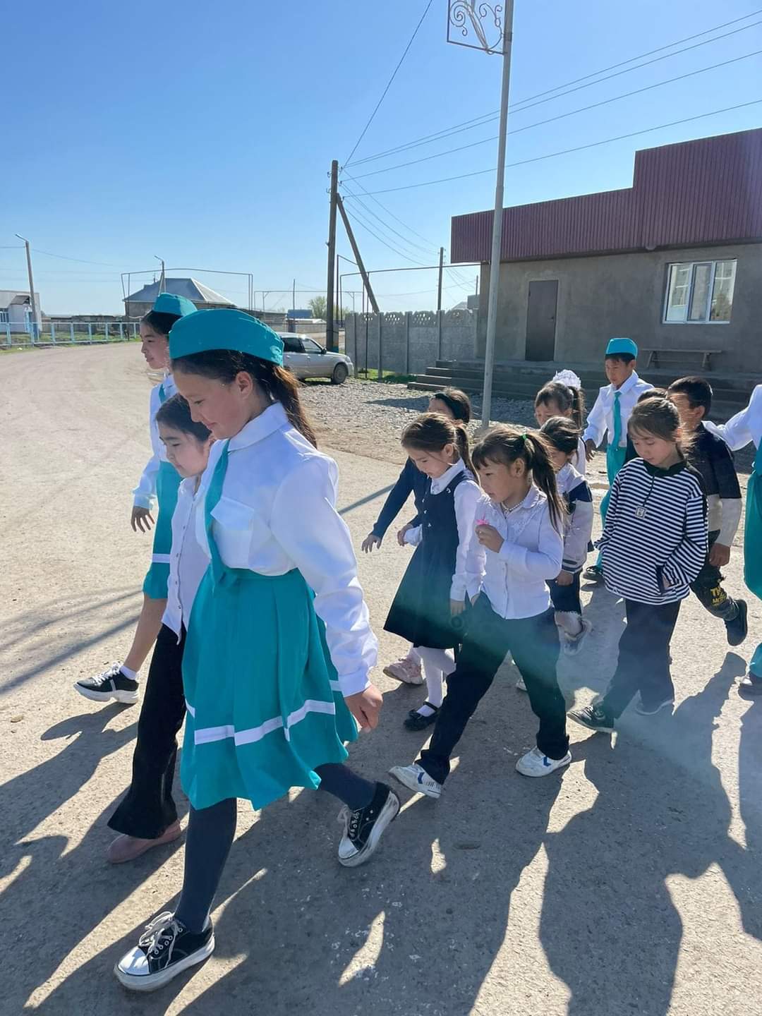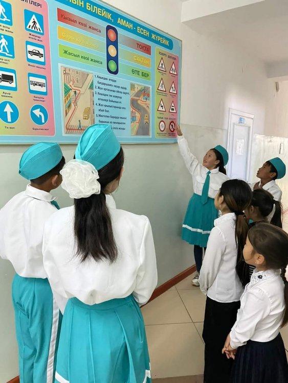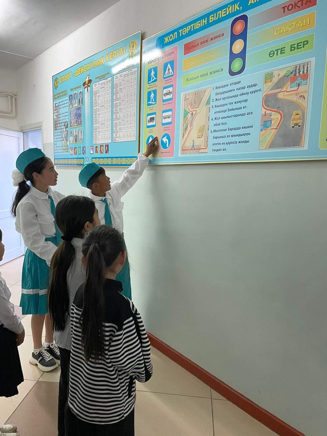 Жамбыл облысы Байзақ ауданы, Жаңатұрмыс орта мектеп жасындағы балалардың жолда жүру қауіпсіздігін қамтамасыз ету және алдын алу жөніндегі іс-шара жоспарына сәйкес "Жас инспекторлар" тобы оқушыларға "Қауіпсіз жол" атты түсіндірме жұмыстарын жүргізді.