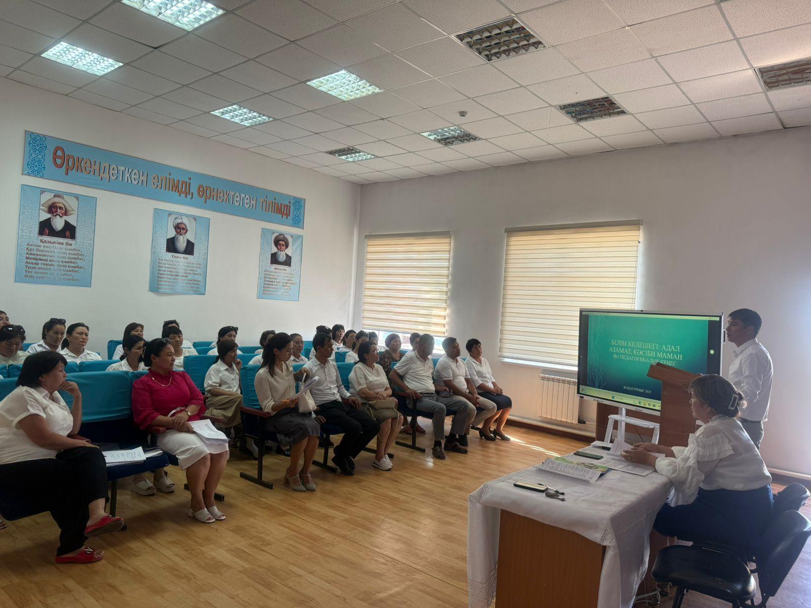 "Білім беру ұйымының 2025-2026 оқу жылындағы білім беру саясаты мен басымдықтары" тақырыбында. Педагогикалық кеңеске мектеп ұжымы мен Жамбыл облысы білім басқармасының әдіскері Айлауова Жансая Сламханқызы қатысты.