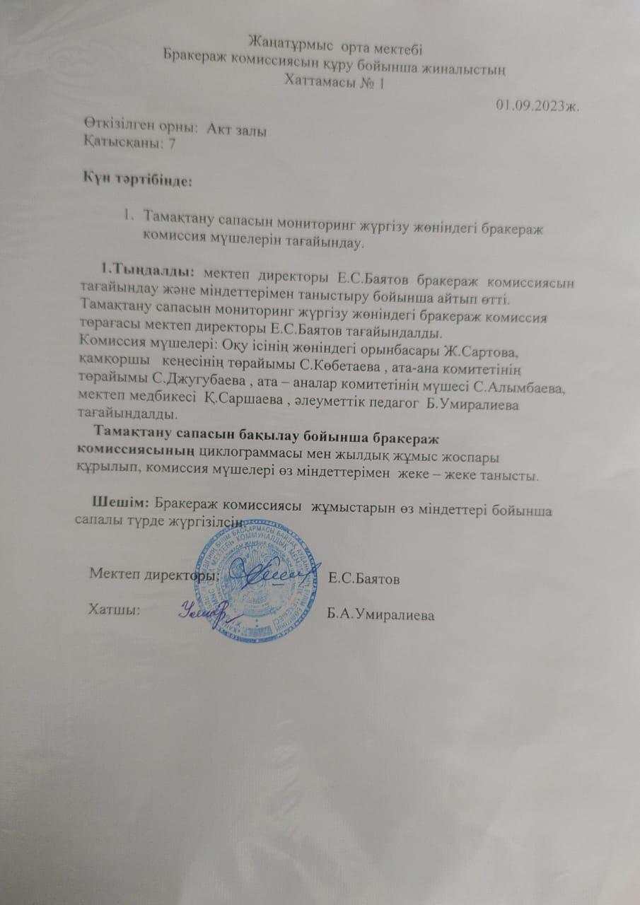 01 сентябрь 2023 0 1 2 3 4 5 Бракераж комиссиясын құру бойынша жиналыстың хаттамасы Жаңатұрмыс орта мектебі. Бракераж комиссиясын құру бойынша жиналыстың хаттамасы