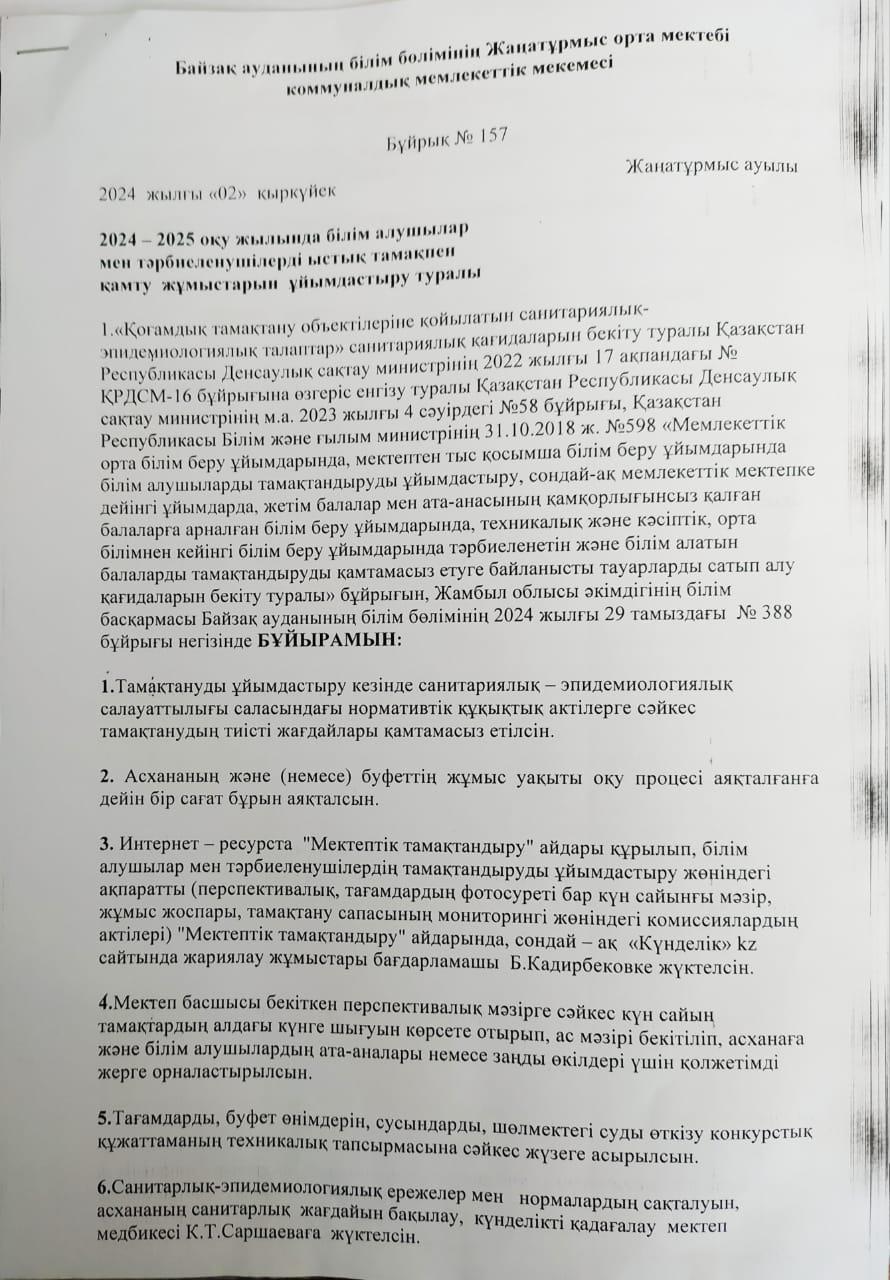 02 сентябрь 2024 0 1 2 3 4 5 Ыстық тамақпен қамту жұмыстарын ұйымдастыру туралы Ыстық тамақпен қамту жұмыстарын ұйымдастыру туралы