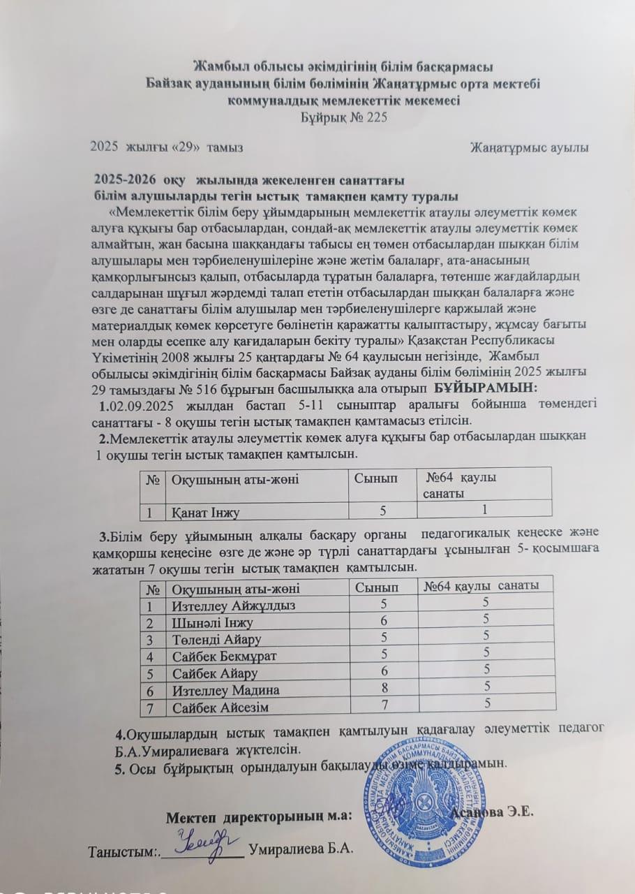18 сентябрь 2025 0 1 2 3 4 5 2025-2026 оқу жылында жекеленген санаттағы білім алушыларды тегін ыстық тамақпен қамту туралы