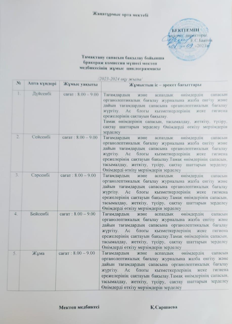 01 сентябрь 2023 0 1 2 3 4 5 Мектеп медбикесінің жұмыс циклограммасы Мектеп медбикесінің жұмыс циклограммасы