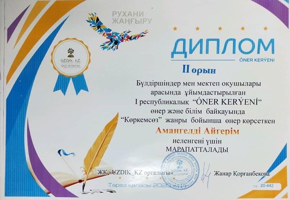 "Көркемсөз" жаныры бойынша өнер көрсеткені үшін ІІ орынмен марапатталды.