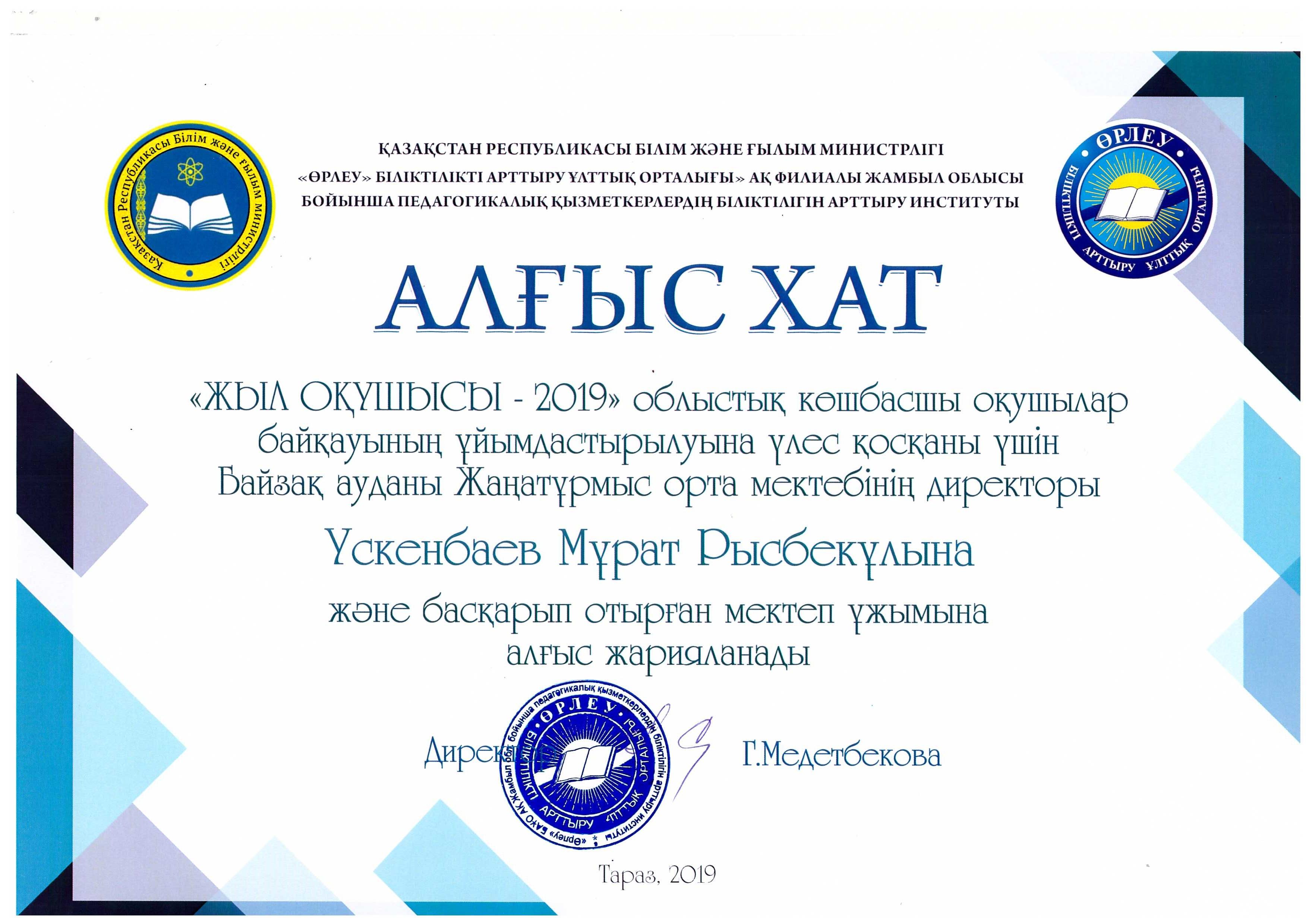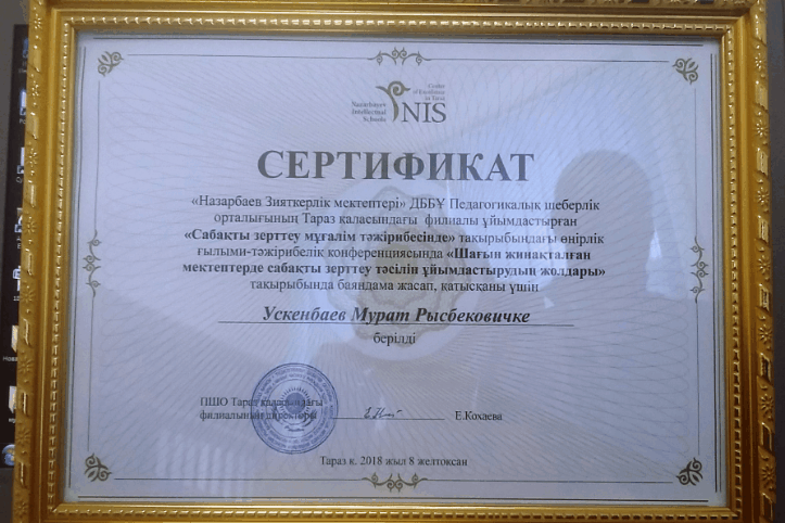 2018 жылдың 8 желтоқсан күні Тараз қаласы "Назарбаев Зияткерлік мектептері" ДББҰ Педагогикалық шеберлік орталығының ұйымдастыруымен "Сабақты зерттеу мұғалім тәжірбиесінде" тақырыбындағы өңірлік ғылыми - тәжірибелік конференциясында "Шағын жинақталған мектептерде сабақты зерттеу тәсілін ұйымдастырудың жолдары" тақырыбында баяндама жасап, қатысқаны үшін Жаңатұрмыс орта мектебінің директоры М.Р.Ускенбаевқа сертификат берілді