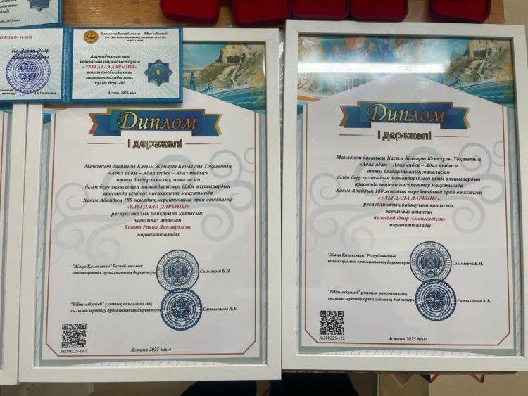 Мемлекет басшысы Қасым Жомарт Кемелұлы Тоқаевтың «Адал адам-Адал еңбек-Адал табыс» атты бағдарламалық мақаласын білім беру саласының мамандары мен білім алушылардың арасында кеңінен насихаттау мақсатында Хакім Абайдың 180 жылдық мерейтойына орай өткізілген «ҰЛЫ ДАЛА ДАРЫНЫ» республикалық байқауына қатысып, жеңімпаз атанған Ермұрат Жансұлтан Жандосұлы, Ержан Айсұлтан Асылбекұлы,Келдібай Әмир Аманкелдіұлы,Қанат Раяна Даниярқызы,Бақытбак Сұлтан Дидарұлы,Жақсылық Раяна Нұрболатқызы